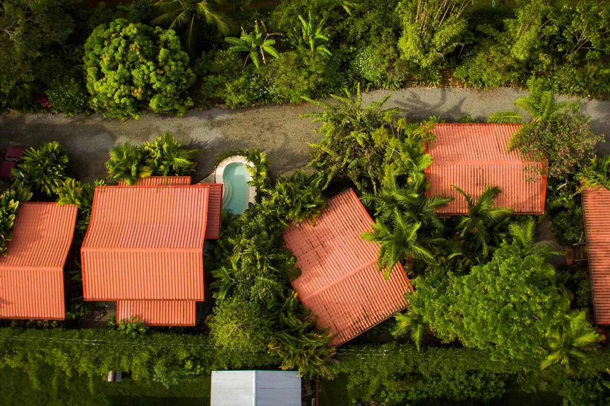 The location of the lodge is relatively remote (there’s wi-fi but no cell reception), nestled in a tropical garden and wildlife, composed of spacious private villas and rooms (with their private bathrooms), accommodating up to 3 guests, a common area, open-air palm-roofed rancho with hammocks, where the communal dinners are held, and a jungle yoga studio.